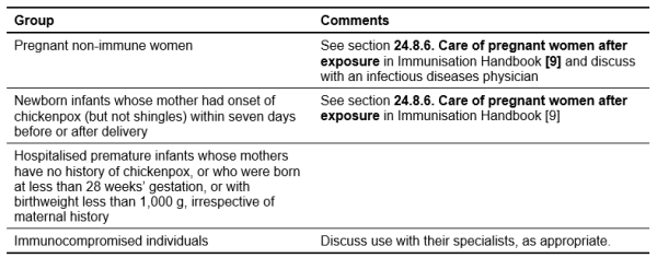 Table 5.9: Use of Zoster Immunoglobulin-VF for prophylaxis against varicella in patients where exposure occurred and susceptibility is likely [9].